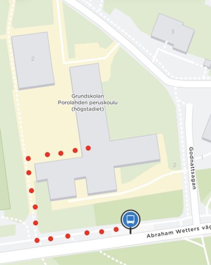 Bus 83 to Tammelund from Hertonäs stops outside the school. The bus stop (Godnattsagan) is shown in the photo. Parking is available in the courtyard.